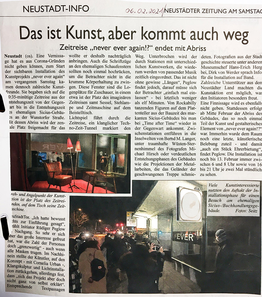 Die einstige Buchhandlung weicht nach aktuellem Planungsstand einem „Tor zur Innenstadt“, umrahmt von Geschäfts-und Bürogebäuden. „Neustadt ist gespannt darauf. So ein Tor, das sollte schon einladend sein“, heißt es in einer der kurzen Textpassagen während der Show. Und Rüdiger Peglow lobt das Zusammenspiel mit Stiftung und Unternehmen. Renommierte Betriebe wie Fahlke und Dettmer (Lichttechnik), Strecker (Tischlerei), Neubert (Werbung) und Meineke (Raumdecor) hätten mit großzügiger Hilfe bei Raumgestaltung und Technik die Aktion überhaupt erst ermöglicht. Peglow hofft auf nachhaltigen Erfolg: „Innenstädte müssen sich anpassen. Wir brauchen eine höhere Aufenthaltsqualität mit neuen Möglichkeiten, sich zu treffen.“ Die kleine Show habe entsprechend Anreiz zum Nachdenken geben sollen, Plätze und Räume zu erhalten oder neu zu schaffen, die dem „Treffen“ dienen könnten.